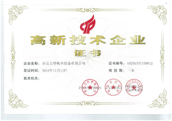 青岛立特机电设备有限公司于2018年11月份荣获由国家税务总局、青岛市税务局、青岛市财政局、青岛市科学技术局联合颁发的高新技术企业证书,正式跻身于高新技术企业行列。